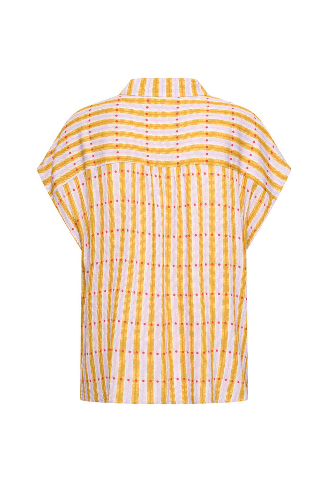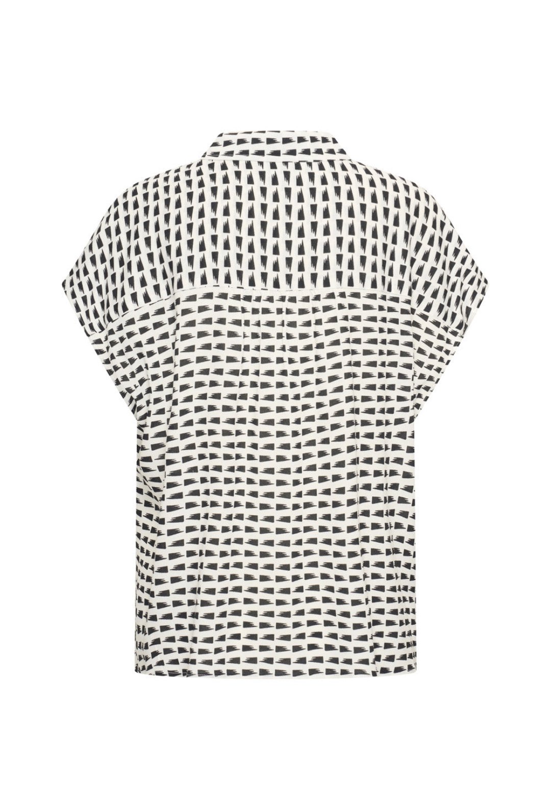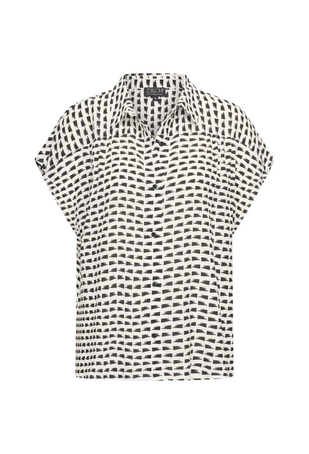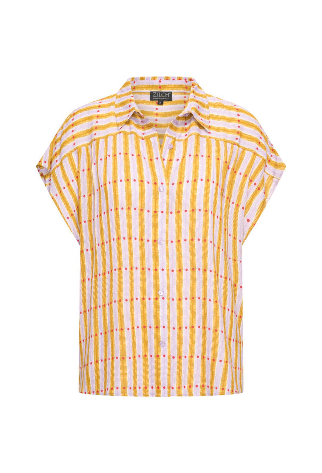 Chemisier d’été élégant à col et manches courtes, confectionné en mousseline légère à imprimés estivaux variés. Ce chemisier présente de petits plis au dos et sur devant,et une coupe ample.