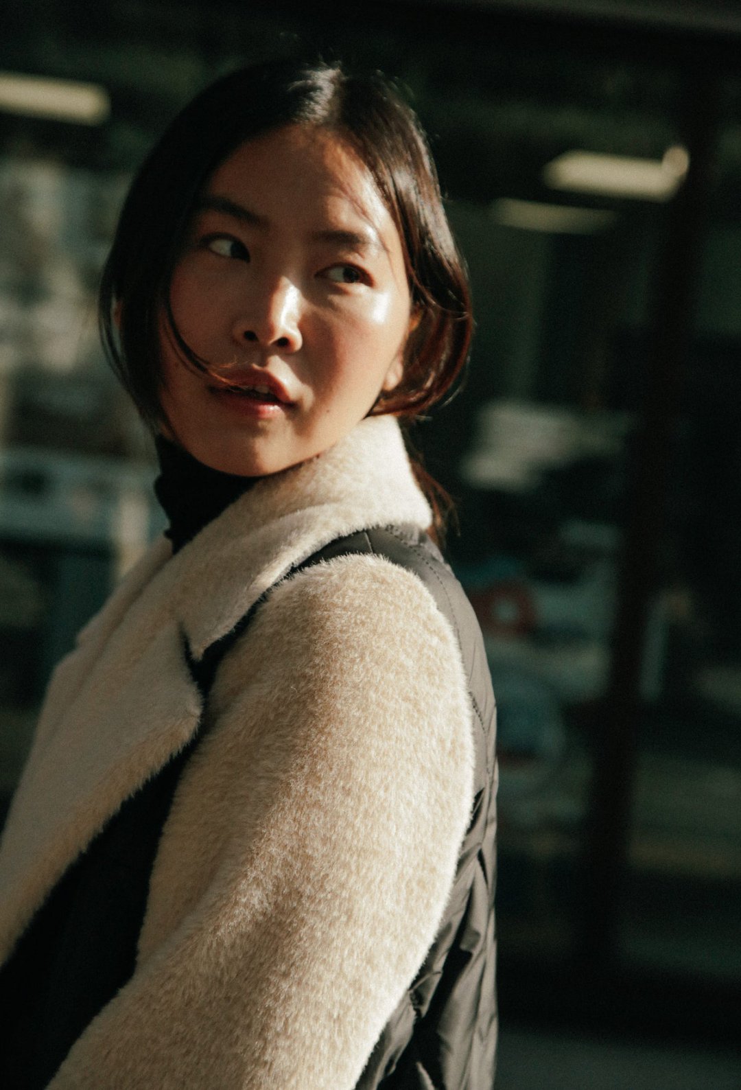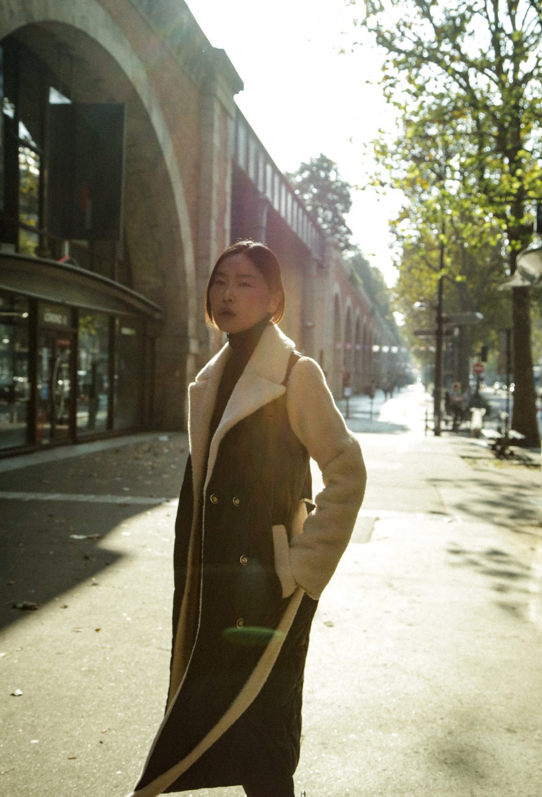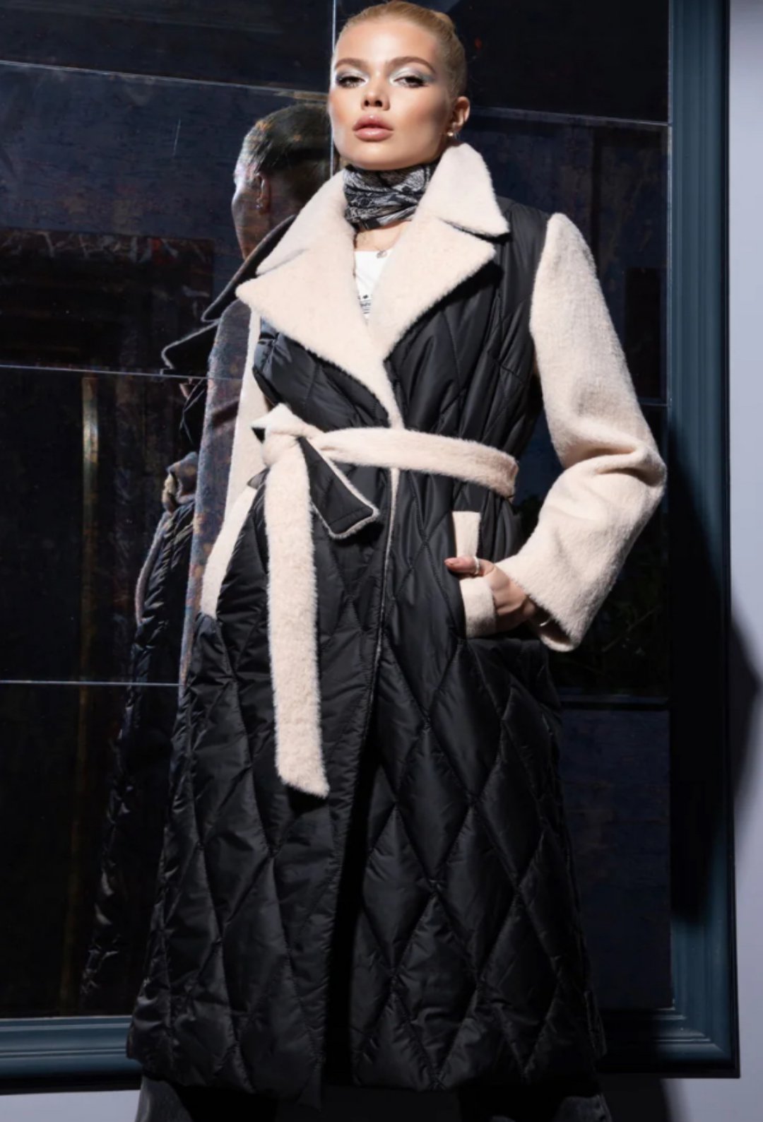 Les poches sont rehaussées de fausse fourrure et la ceinture en contraste de matière vient souligner la taille et le col éclairer le visage.