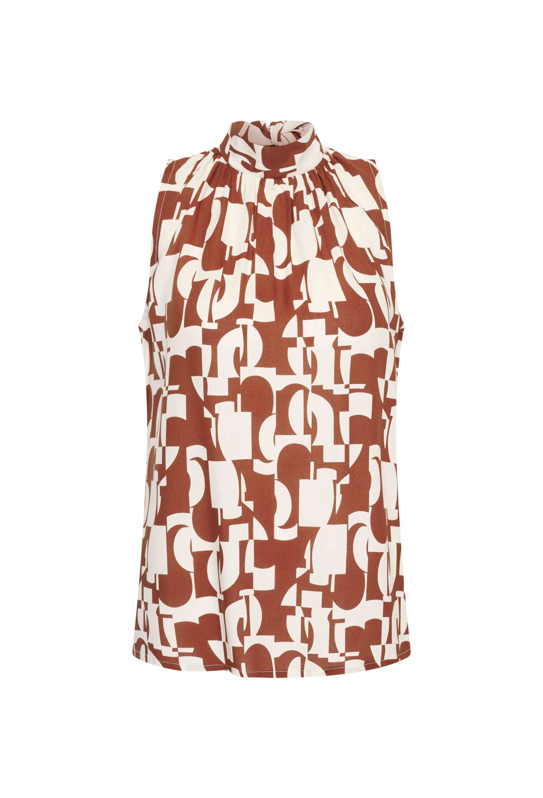 Top d’été sans manches en viscose légère et écologique, dans imprimés estivaux. Ce top présente un col montant et un nœud dans le dos. À associer avec le pantalon assorti pour créer une tenue estivale élégante.